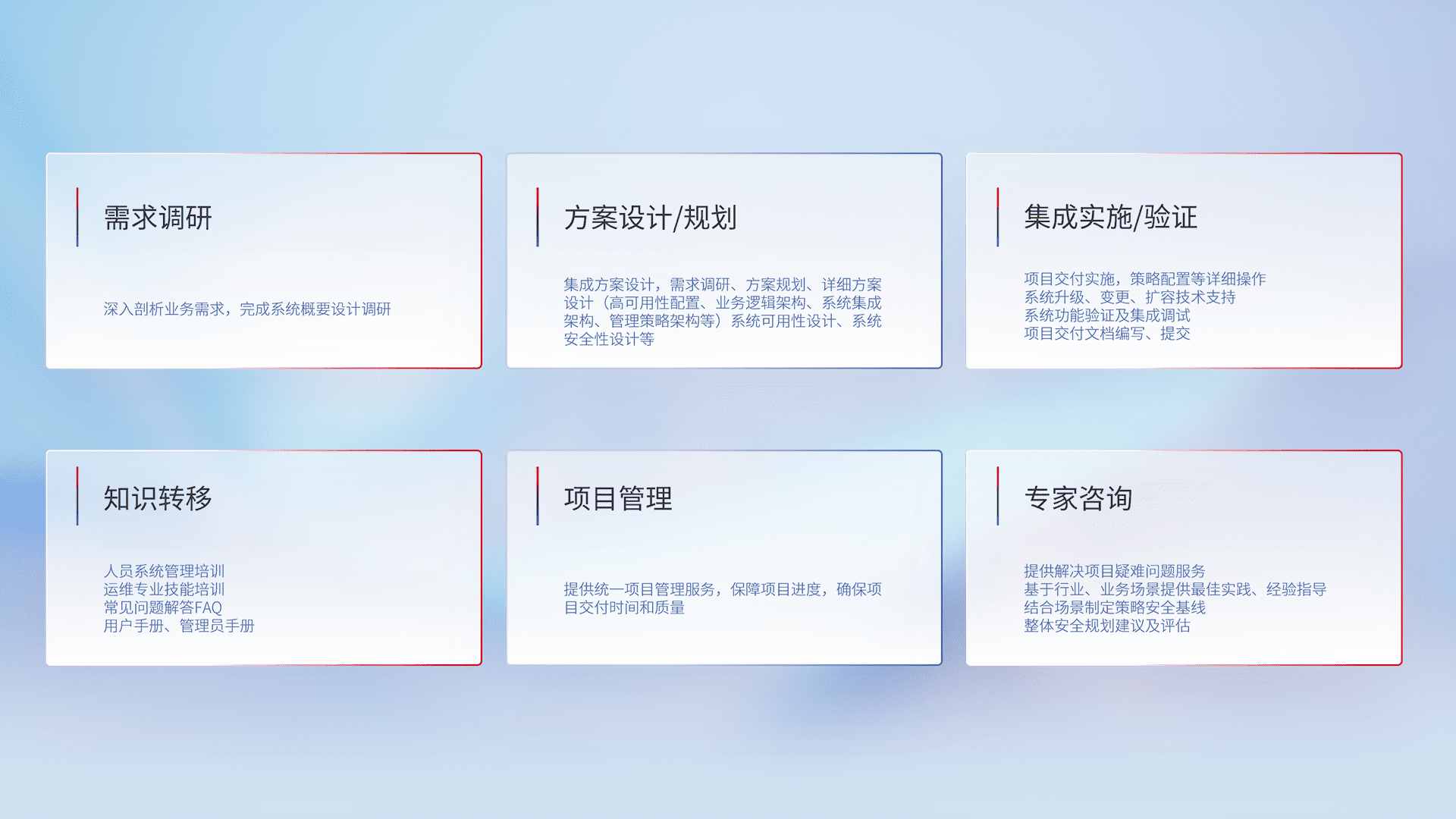 针对客户行业特性,,,将宏观的安全战略和需求,,,,通过专业的交付服务,,,实现项目落地,,,,为客户提供标准规范的集成交付服务。。。。